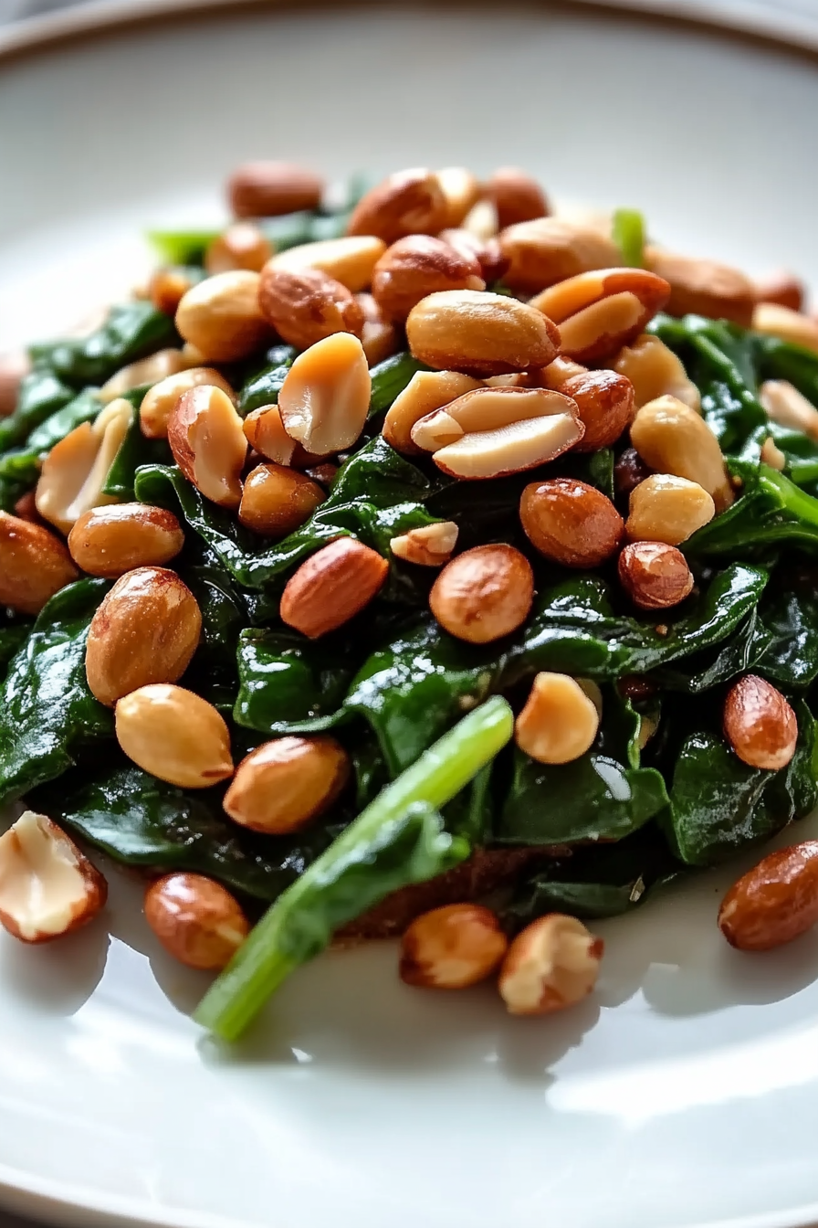 - Place the spinach in a bowl and add the roasted peanuts, chopped garlic, ginger, sugar, salt, MSG, and 3 tbsp of aged vinegar.