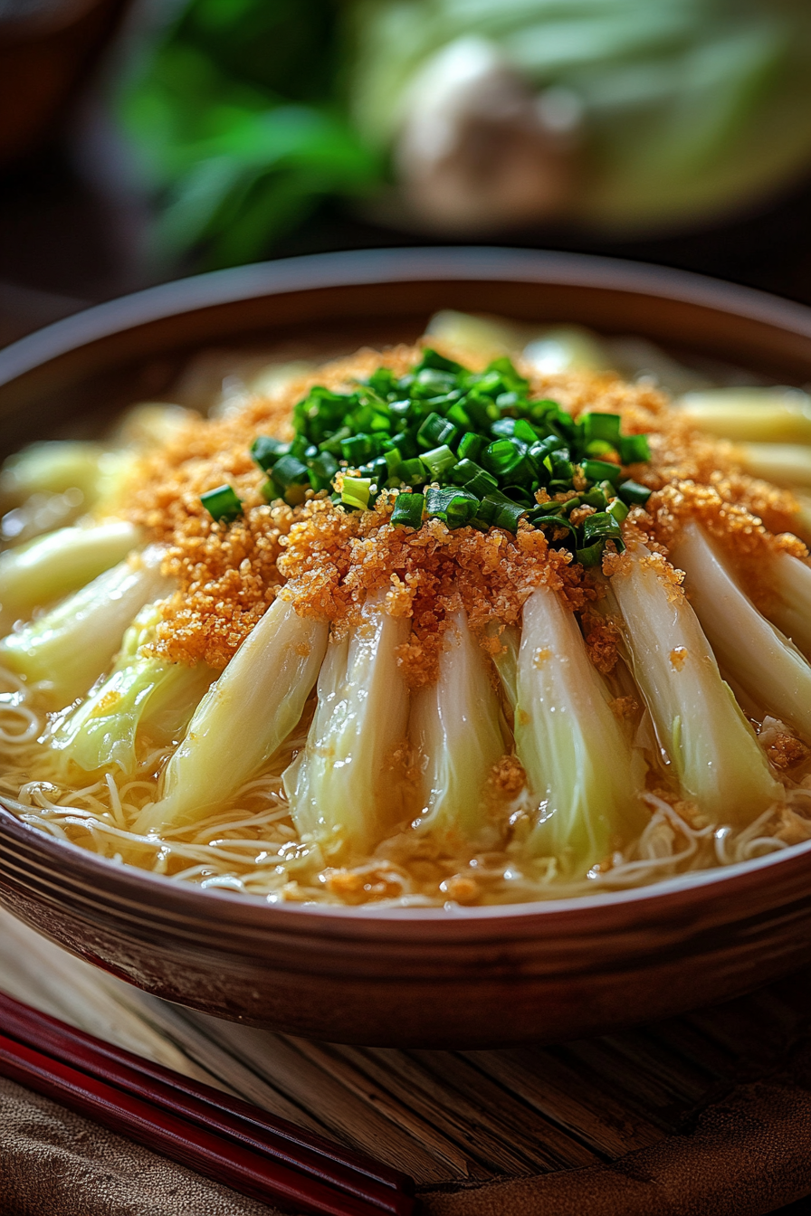 - Wash the baby Chinese cabbage and arrange the leaves on the bottom of a deep plate or shallow bowl.