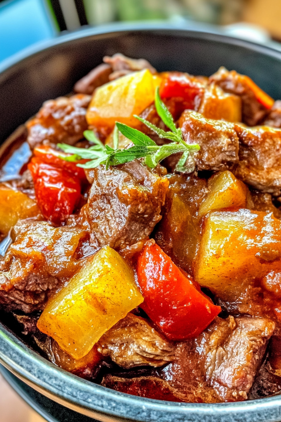 - Transfer all ingredients to a clay pot or enameled cast iron pot. Add water to cover the ingredients. Season with salt. If the tanginess is insufficient, you can add some tomato paste.